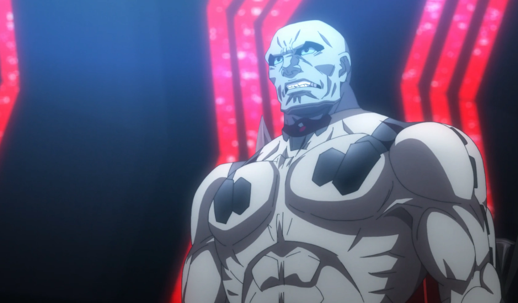 His eyes were blue and he had bushy eyebrows. When he entered battle mode, his sclera turned a light blue color, and a dark outline appeared around his eyes,[5] which is a characteristic of his species.[8]