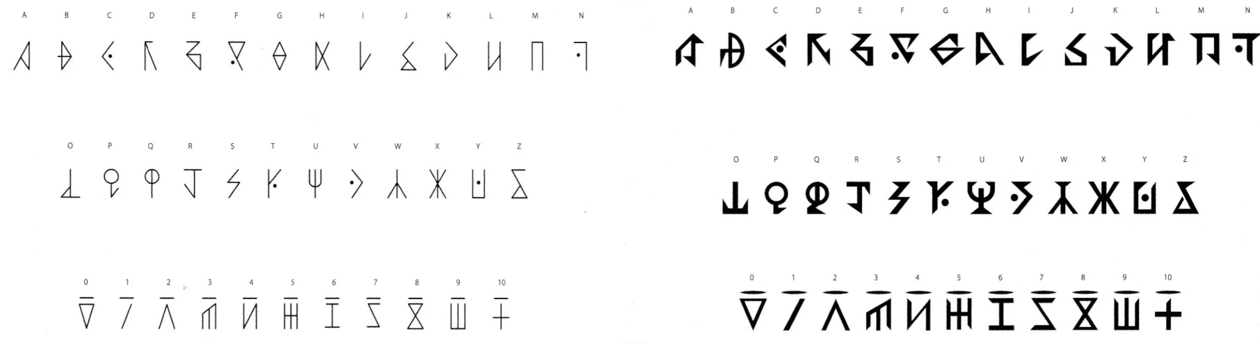 The Garmillas language is written using the Garmillas alphabet, whose glyphs are comparable to those of the latin alphabet.[1]