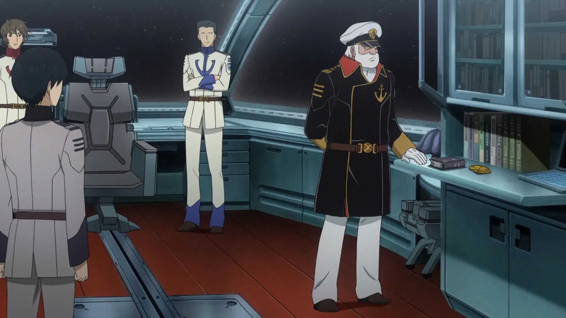 Days later, Okita sat at a meeting with his officers where Sanada detailed the information they had managed to deduce from their analysis of one of the enemy androids that had been captured on Enceladus. They believed that Garmillas used their same mathematics and understood physics in the same way the Earthlings did, and the Admiral sumrised this by saying it “allowed them to play shogi with the same rules.” The automata suddenly went rogue and escaped from the analysis room, prompting Okita to deploy the security department to stop it. It eventually exited from the ship and began making its way to the automatic navigation room, where Yurisha was being kept. Okita reiterated that they couldn't allow it to enter the room, and that they would destroy it if there was no other option. However, the android's system failed before they could capture it.[23]