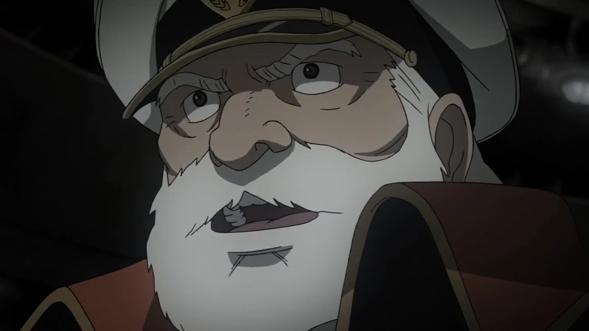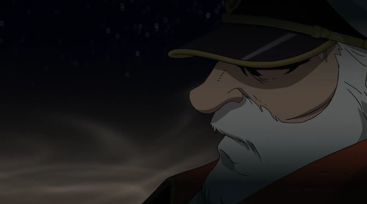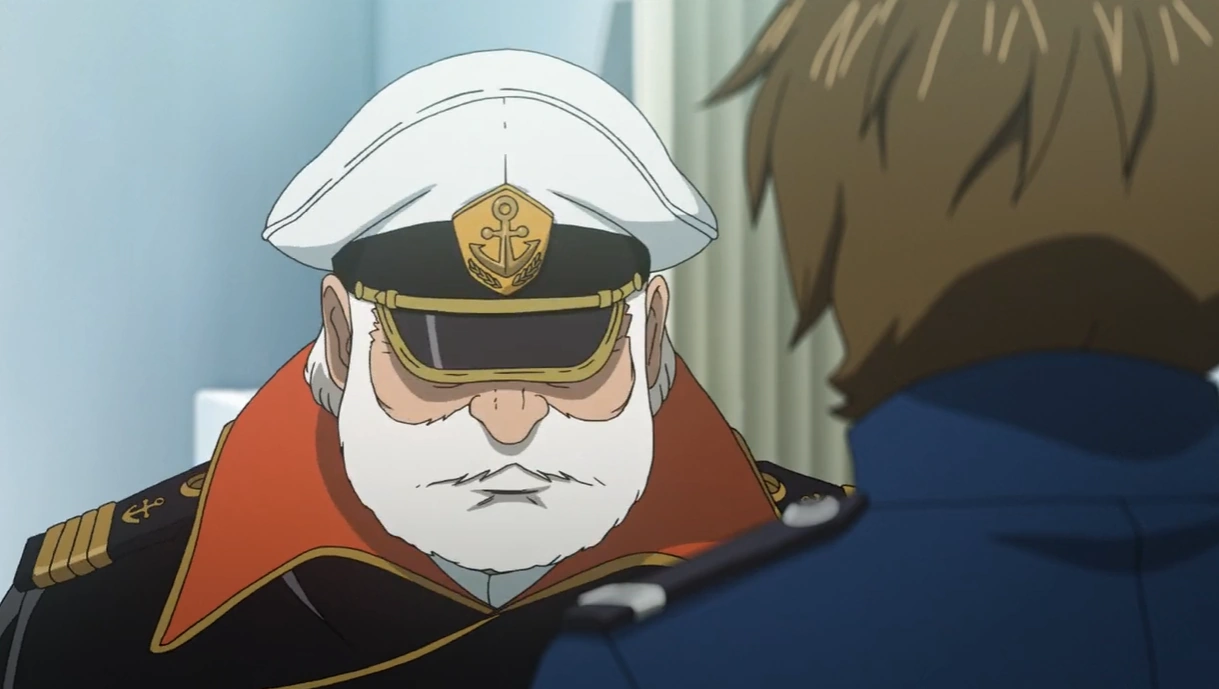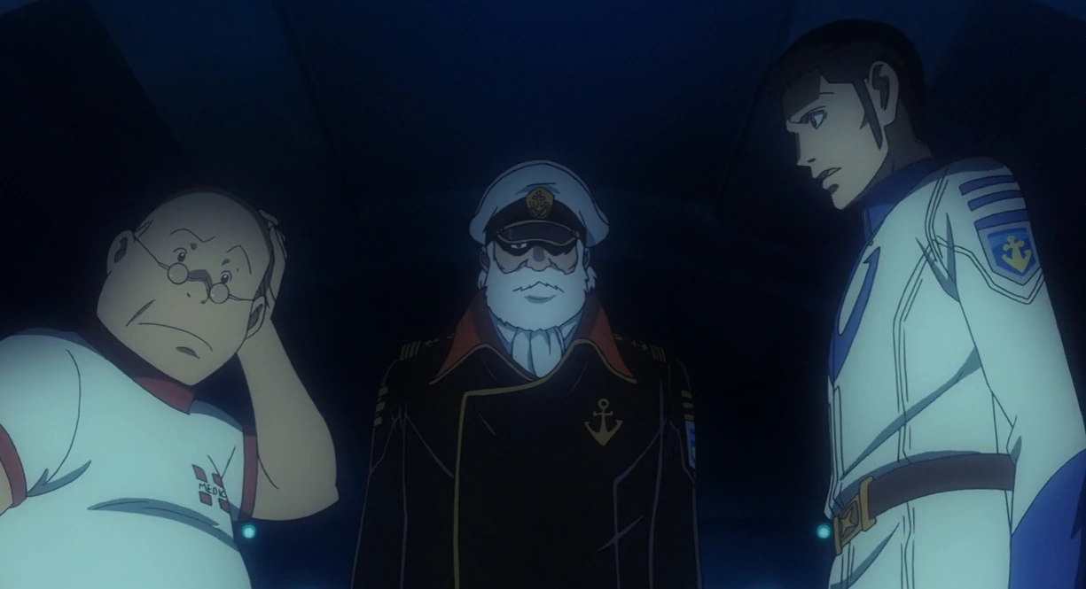 He went back to his cabin and mused over a photo he had taken with his son. He was interrupted by Tokugawa, who noticed the photo and mentioned that a year had already passed from Operation K2. Much to Okita's embarrassment, he said that he had been informed of his visit to the engine room. He took out a bottle of liquor and jokingly asked if the captain had been looking for that, prompting a smile from Okita. The two sat on the floor and began drinking, reminiscing of their years of service together. Tokugawa asked him if he remembered their first ship, and Okita laughed at the memory, stating that it was so small they didn't even bother to name it. The engineer sadly wondered how many young men had died fighting while they got to grow old, but Okita said that he didn't want nor could he allow himself to count them, as people’s lives were more than numbers. He believed that their job as survivors was to ensure the young ones still had hope for tomorrow, and Tokugawa agreed.[9]