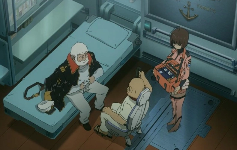 He asked Shima if they could make their way through the hole in the plasma corridor, but Weather Officer Kenjiro Ota informed him that the red dwarf Gliese 581 lay on the other side of the pathway. Despite this, he ordered the ship to make its way toward the star, refusing Sanada's proposal to activate the battleship's wave motion shield. Instead, he ordered the crew to put on environmental suits, to keep energy expenditure at a minimum, and to seal the bulkheads. He then asked Mori to continue to watch the enemy ship's movements on the radar, before another pang of pain made him clutch his chest and collapse. Sado rushed to the bridge, but Okita regained his composure before the doctor arrived. Keeping his cool, he stated that it was just his old wounds acting up. Sado played along to reassure the rest of the crew but insisted on carrying out a brief examination. As he gave the captain a nutrient injection, he sternly scolded him, reminding him that he had been asked to keep him alive and that he would have to follow his orders. Okita cut him off, saying he was well aware of what his actual condition was.[22]
