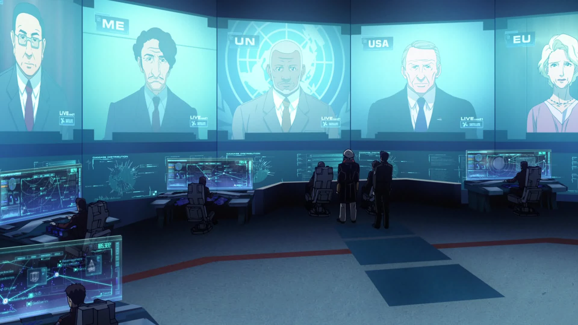 Seated on Earth, the United Nations served as the governing body of the Earthling race during the Great Garmillas War. They were led by the UN Secretary-General. By the year 2199, after the surviving population had retreated to undergound cities, were organized into several administrative districts, which were grouped into six continents and governed by the United Nations Office for Outer Space Affairs.[4] By the end of the Garmillas War, the districts were largely physically isolated from one another. The known administrative districts included the Far-East District, led by Chief Administrator Heikuru Todo,[24] which encompassed Japan;[25] the North American District; and the Middle East. Eurasia and Africa also served as administrative subdivisions.[1] Additionally, other former entities continued to exist under the UN, such as the United States of America, the European Union,[1] and China.[26]